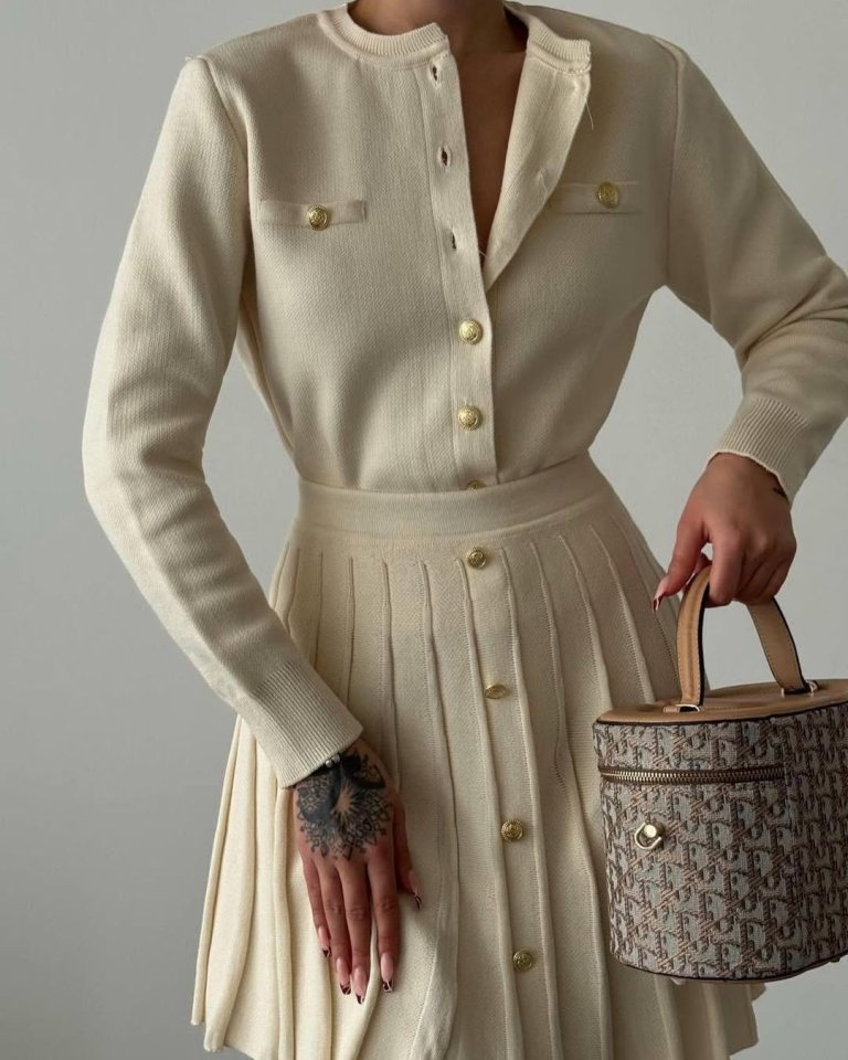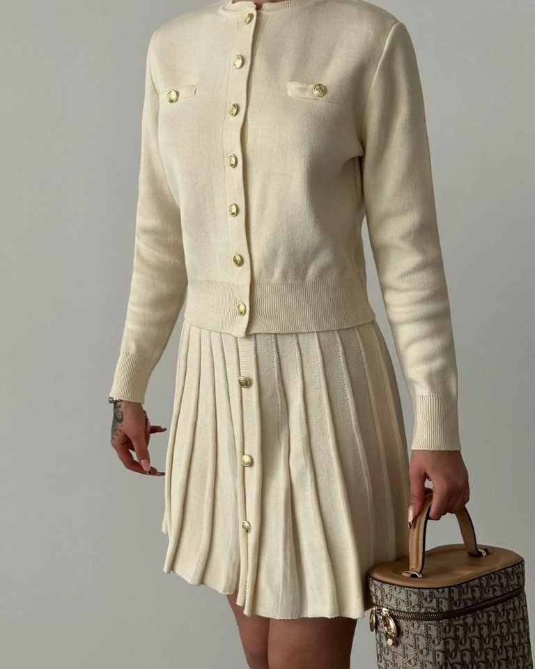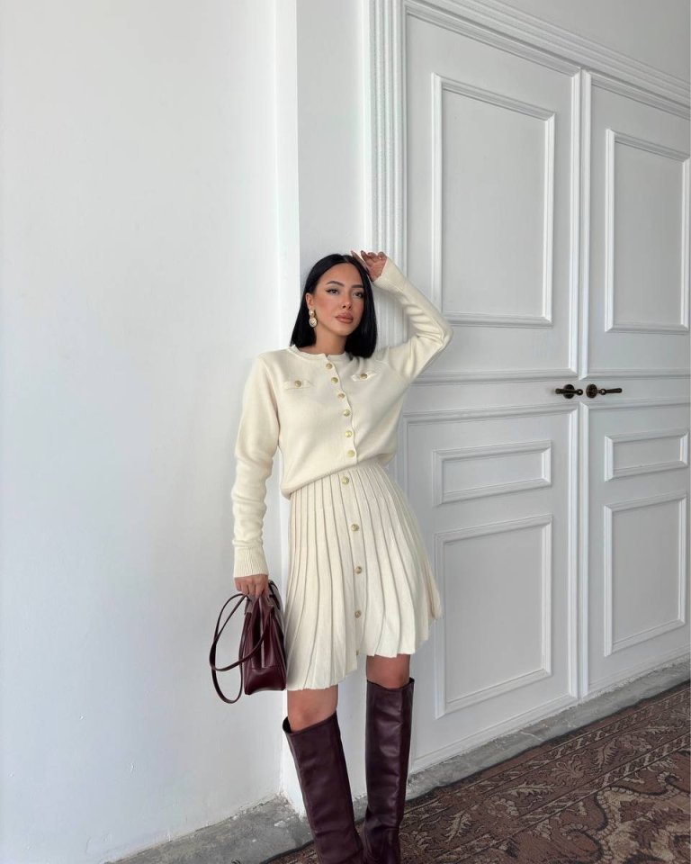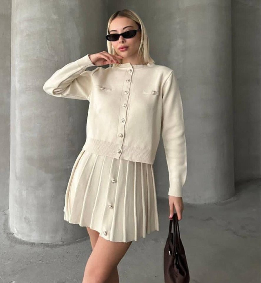 Kadın Uzun Kollu Gold Düğme Detay Yelek Ve Pileli Mini Etek Ikili Takım