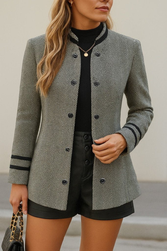 Kadın Uzun Kollu Hakim Yaka Düğme Detaylı Mini Dokuma Ceket
