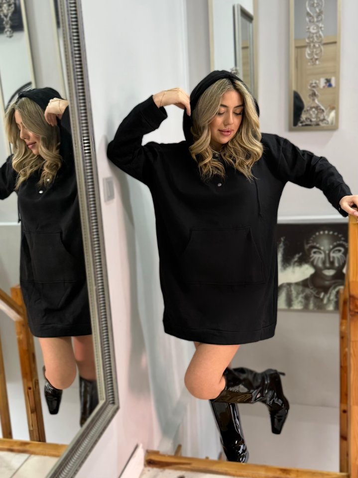 Kadın Uzun Kollu Kapşonlu Bağcıklı önden Düğmeli Ve Cepli Iki Iplik şardonlu Elbise