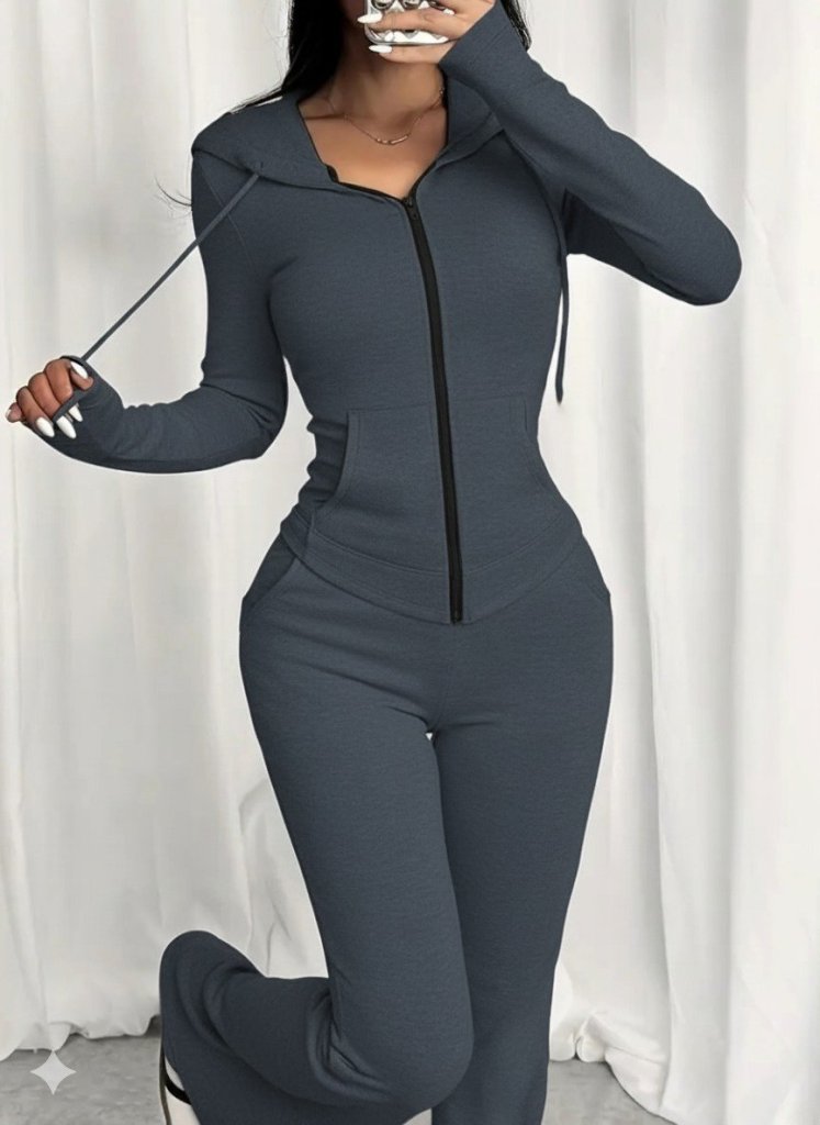 Kadın Uzun Kollu Kapşonlu Bağcıklı önü Fermuarlı Viskon Iki Iplik Bluz Ve Pantolon Ikili Takım