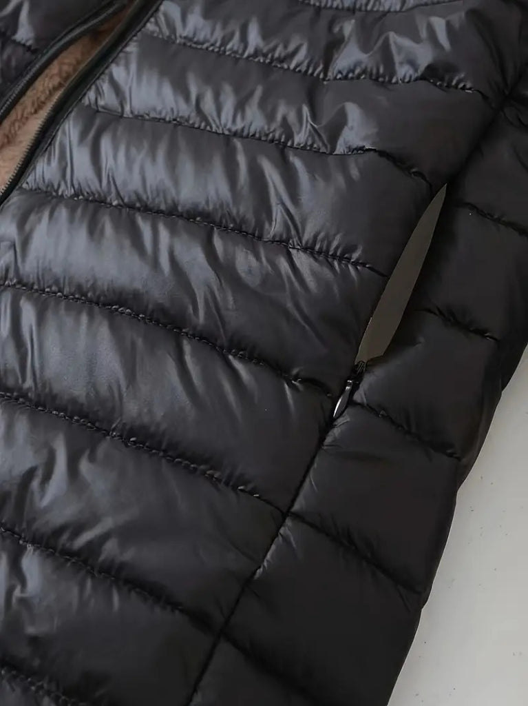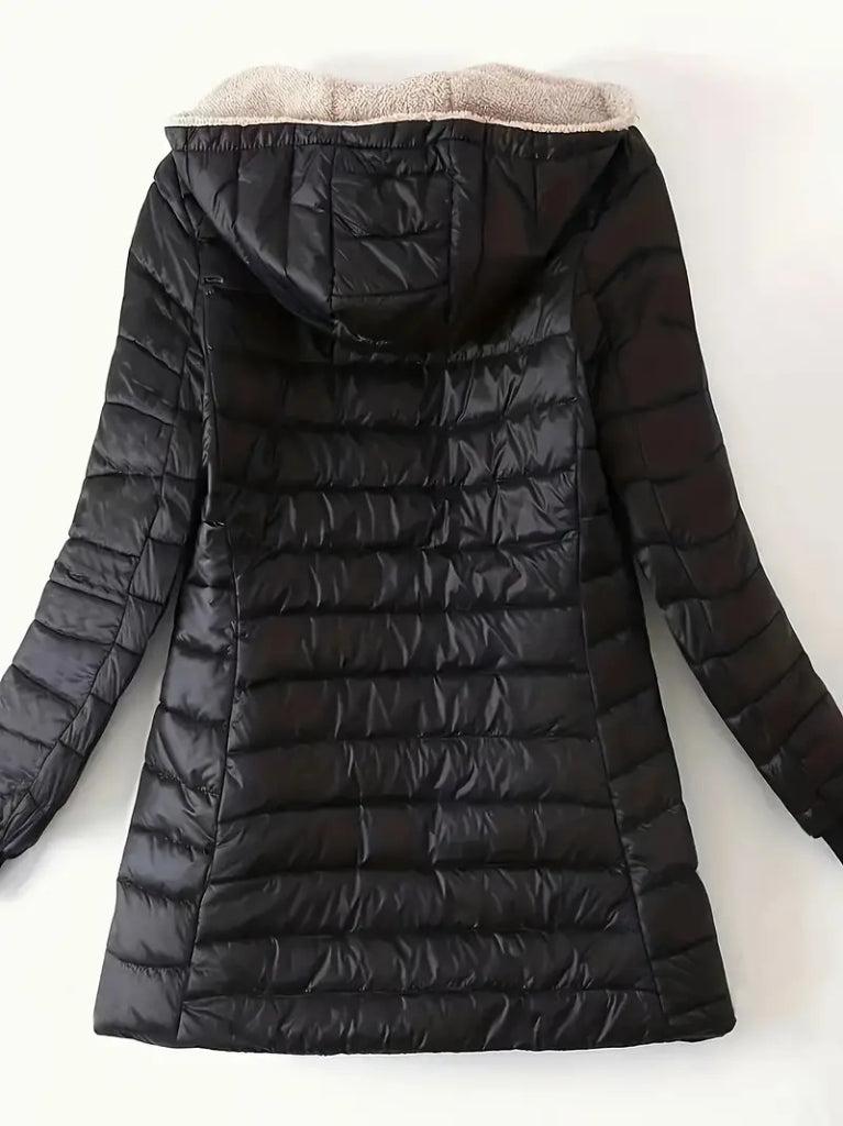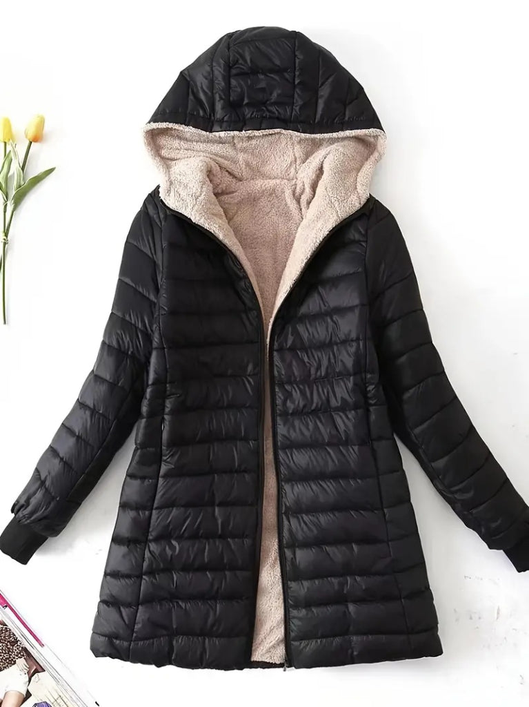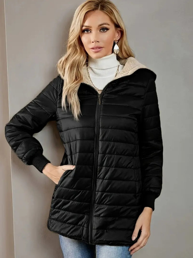Kadın Uzun Kollu Kapşonlu Cep Detaylı Fermuarlı Orta Boy Mont