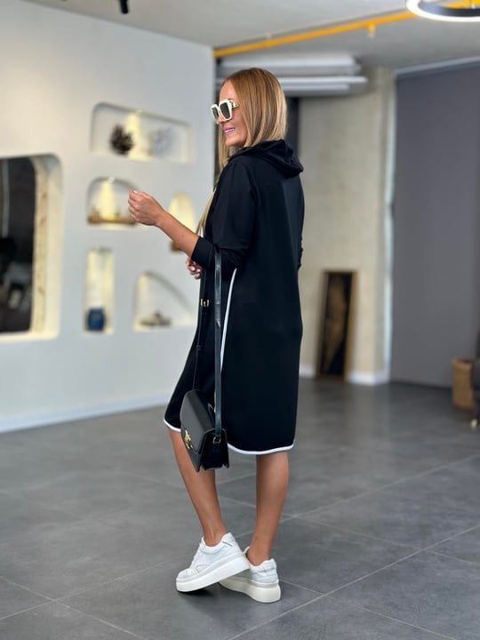 Kadın Uzun Kollu Kapüşon Ve Ribana Detay Diz üstü Elbise