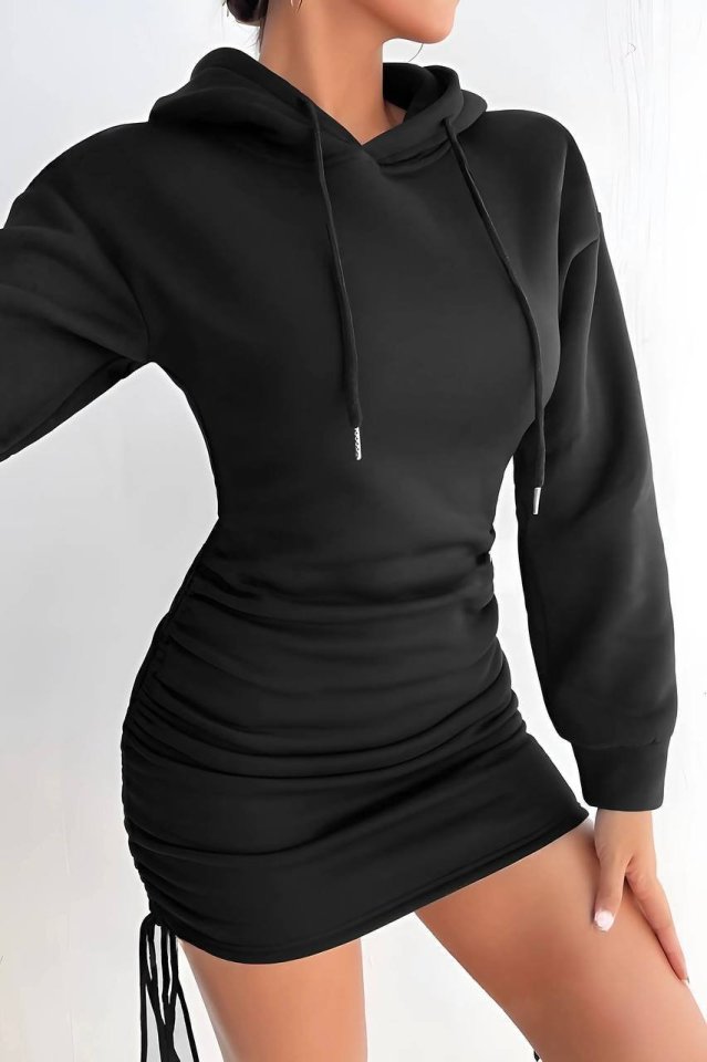 Kadın Uzun Kollu Kapüşon Ve Yandan Büzgü Detay Mini Elbise