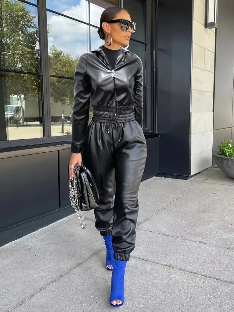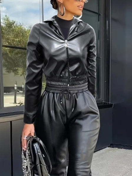 Kadın Uzun Kollu Kapüşonlu Ceket Bel Ve Paçası Lastikli Pantolon Ikili Deri Takım
