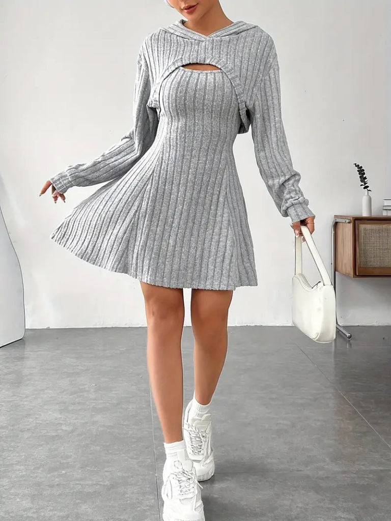Kadın Uzun Kollu Kapüşonlu Ceket üst Ve Askısız Kare Yaka A Kesim şardonlu Kaşkorse Elbise