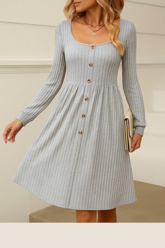 Kadın Uzun Kollu Kare Yaka Düğmeli Kısa şardonlu Iki Iplik Mini Elbise