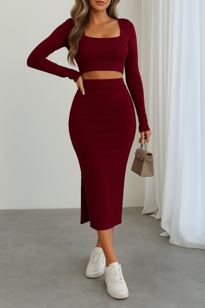 Kadın Uzun Kollu Kaşkorse Crop Ve Etek Takım