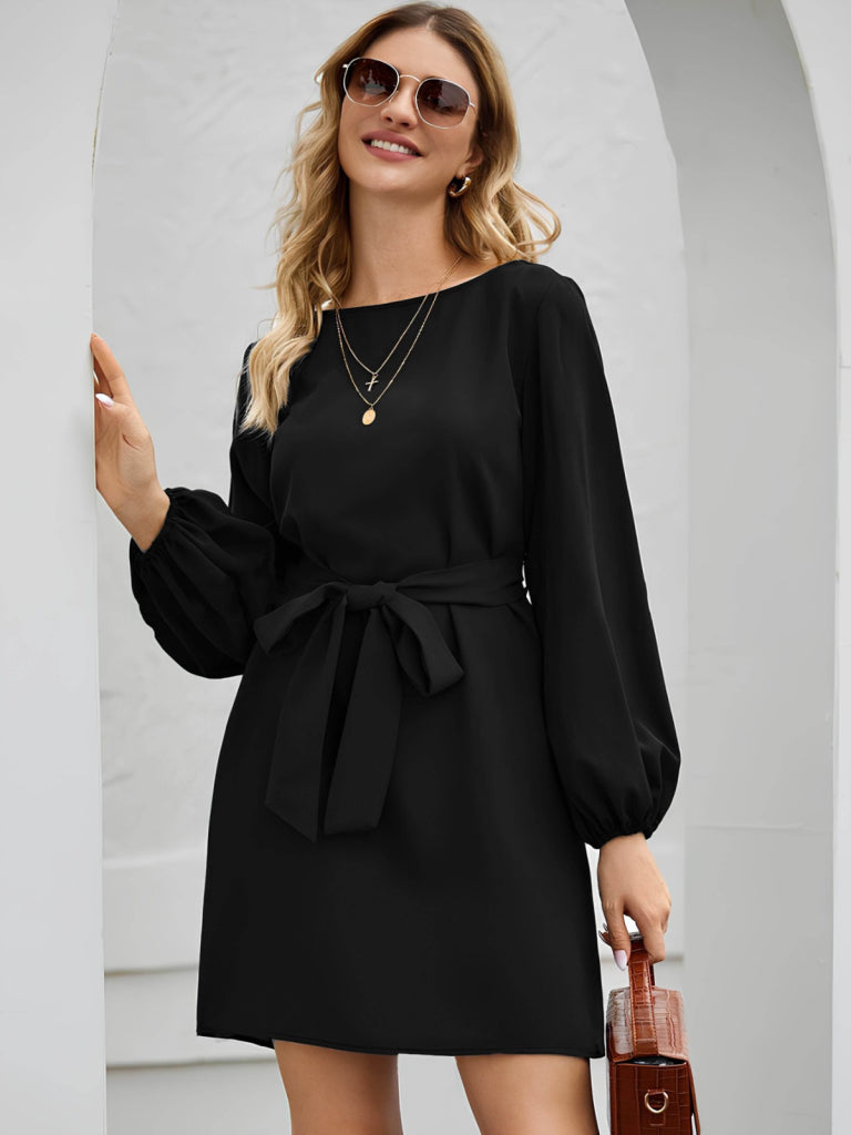 Kadın Uzun Kollu Kayık Yaka Belden Kuşaklı Kısa Ithal Krep Elbise