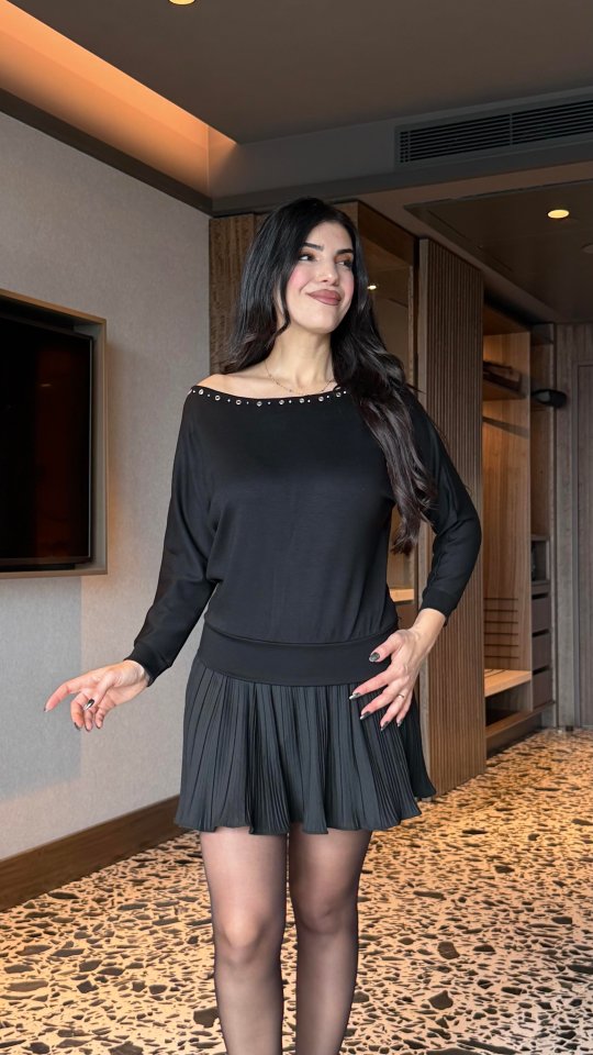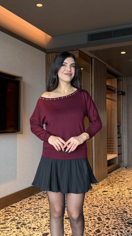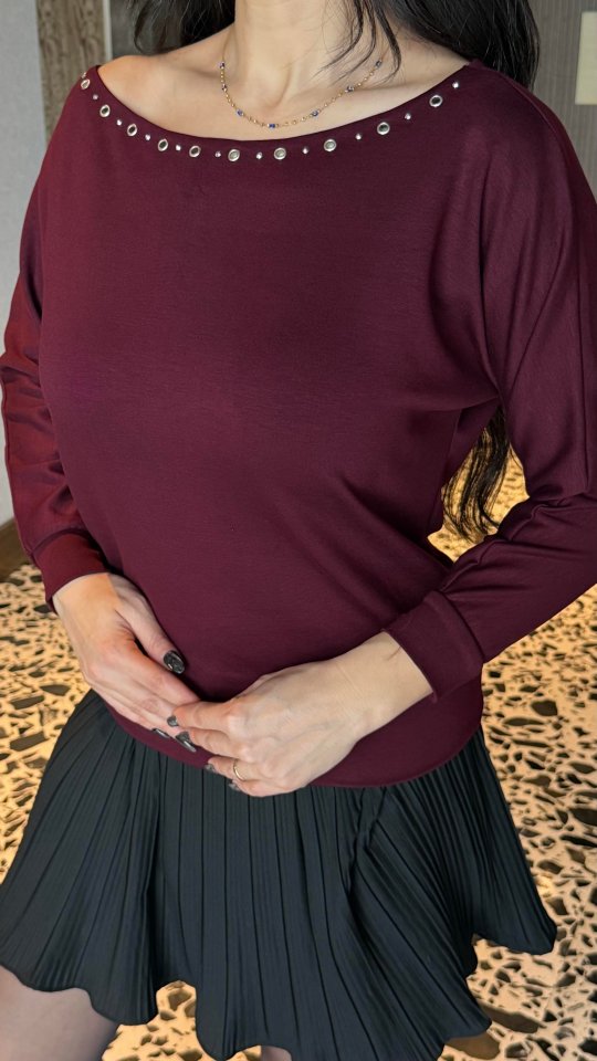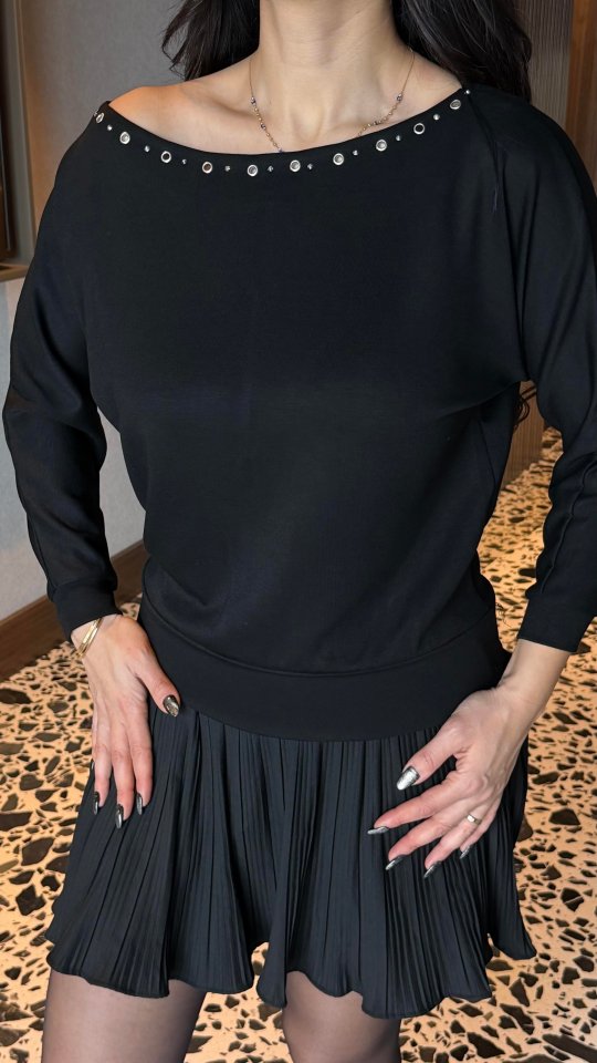 Kadın Uzun Kollu Kayık Yaka Kuş Gözü Detay Bluz
