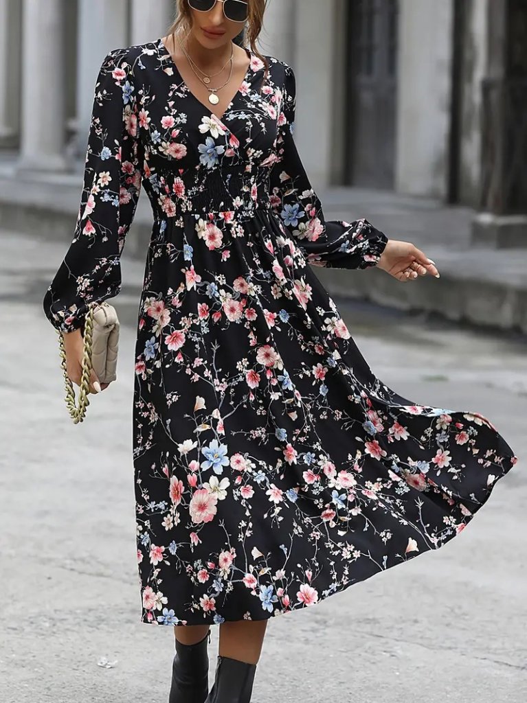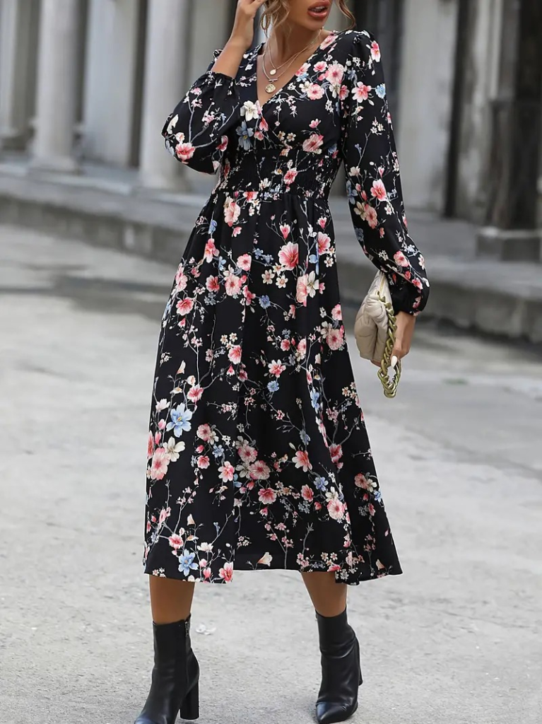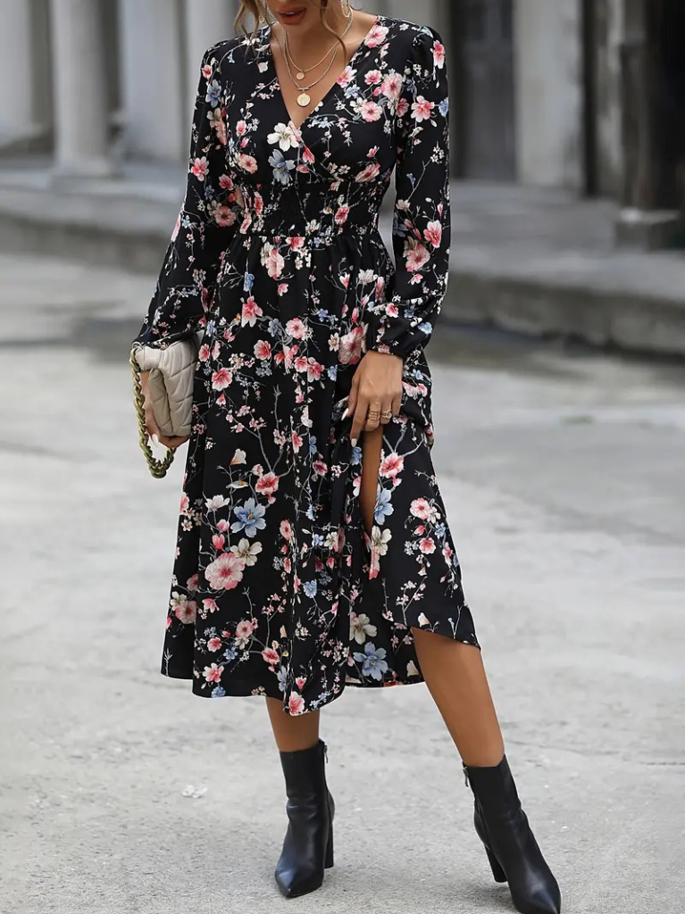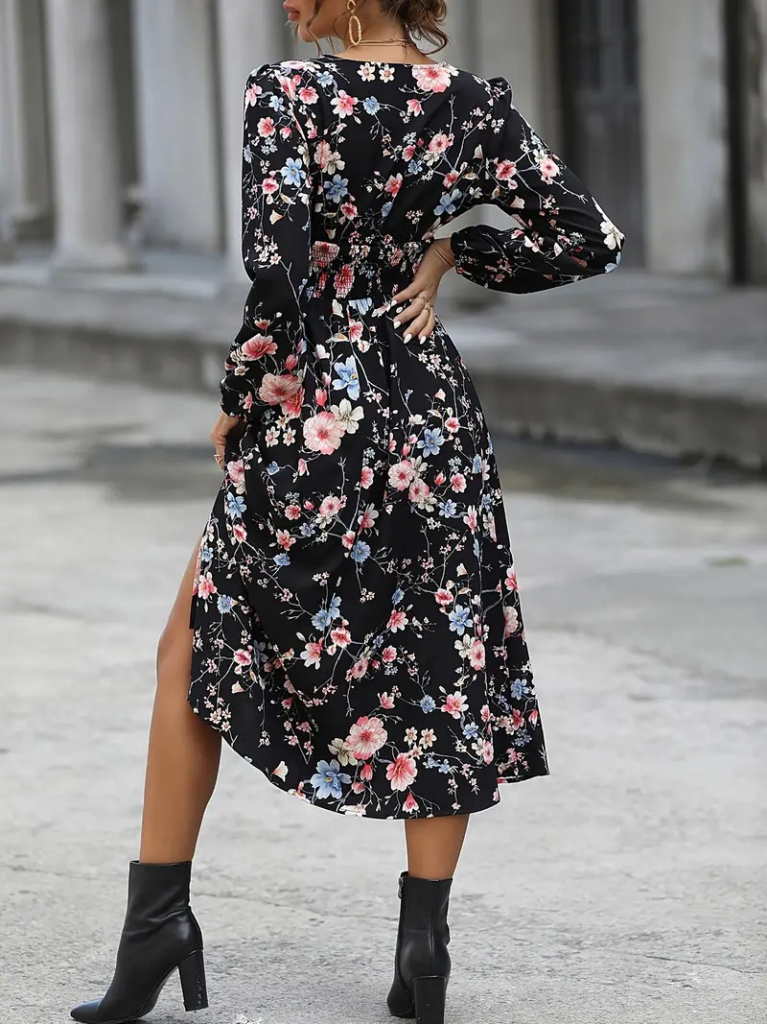 Kadın Uzun Kollu Kruvaze Yaka Beli Lastikli Yandan Yırtmaçlı Desenli Dalgıç Elbise