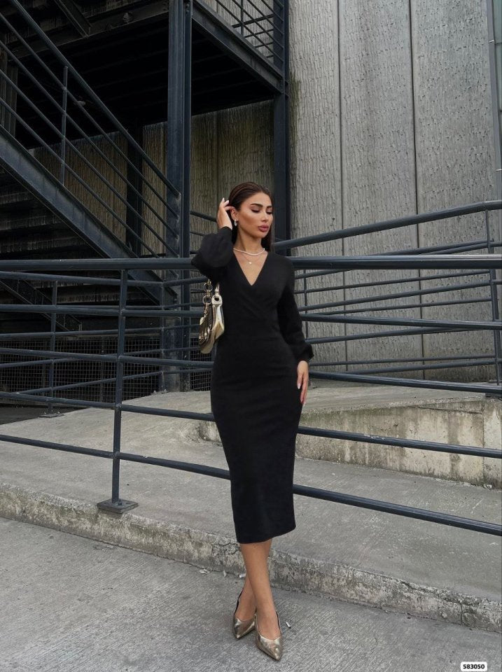 Kadın Uzun Kollu Kruvaze Yaka Büzgü Ve Balon Kol Detay Simli Krep Kumaş Maxi Boy Elbise