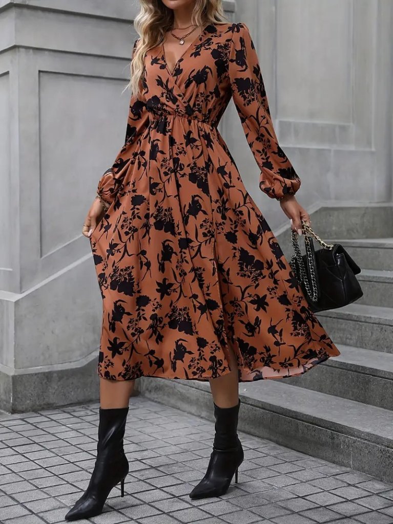 Kadın Uzun Kollu Kruvaze Yaka çiçek Baskılı Yırtmaçlı Midi Süprem Elbise