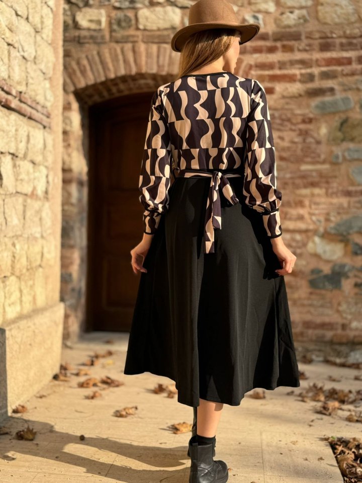 Kadın Uzun Kollu Kruvaze Yaka Dalgıç Krep Midi Boy Elbise