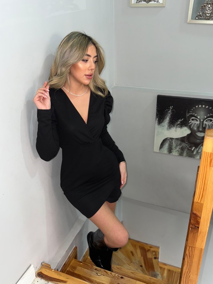 Kadın Uzun Kollu Kruvaze Yaka Kol Detaylı Ithal Krep Mini Elbise