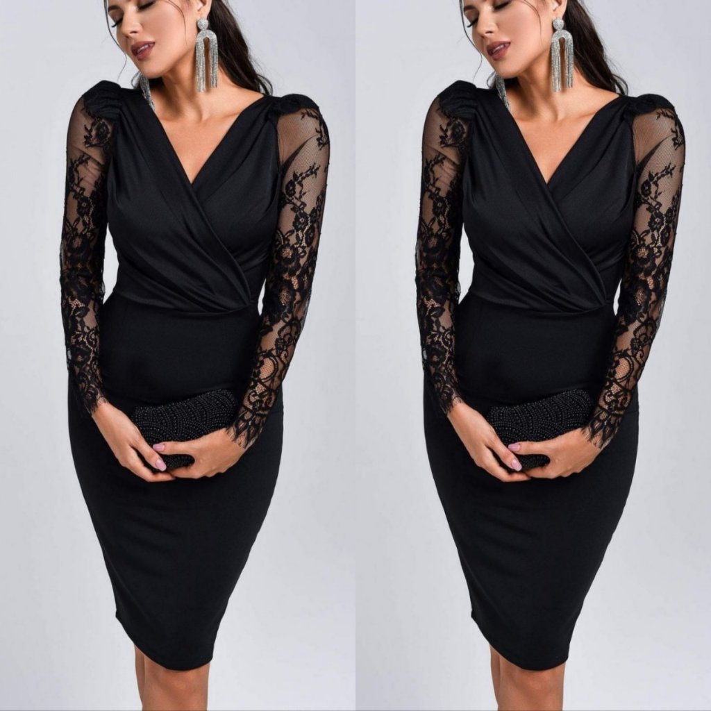 Kadın Uzun Kollu Kruvaze Yaka Kollar Tül Detay Krep Mini Boy Elbise