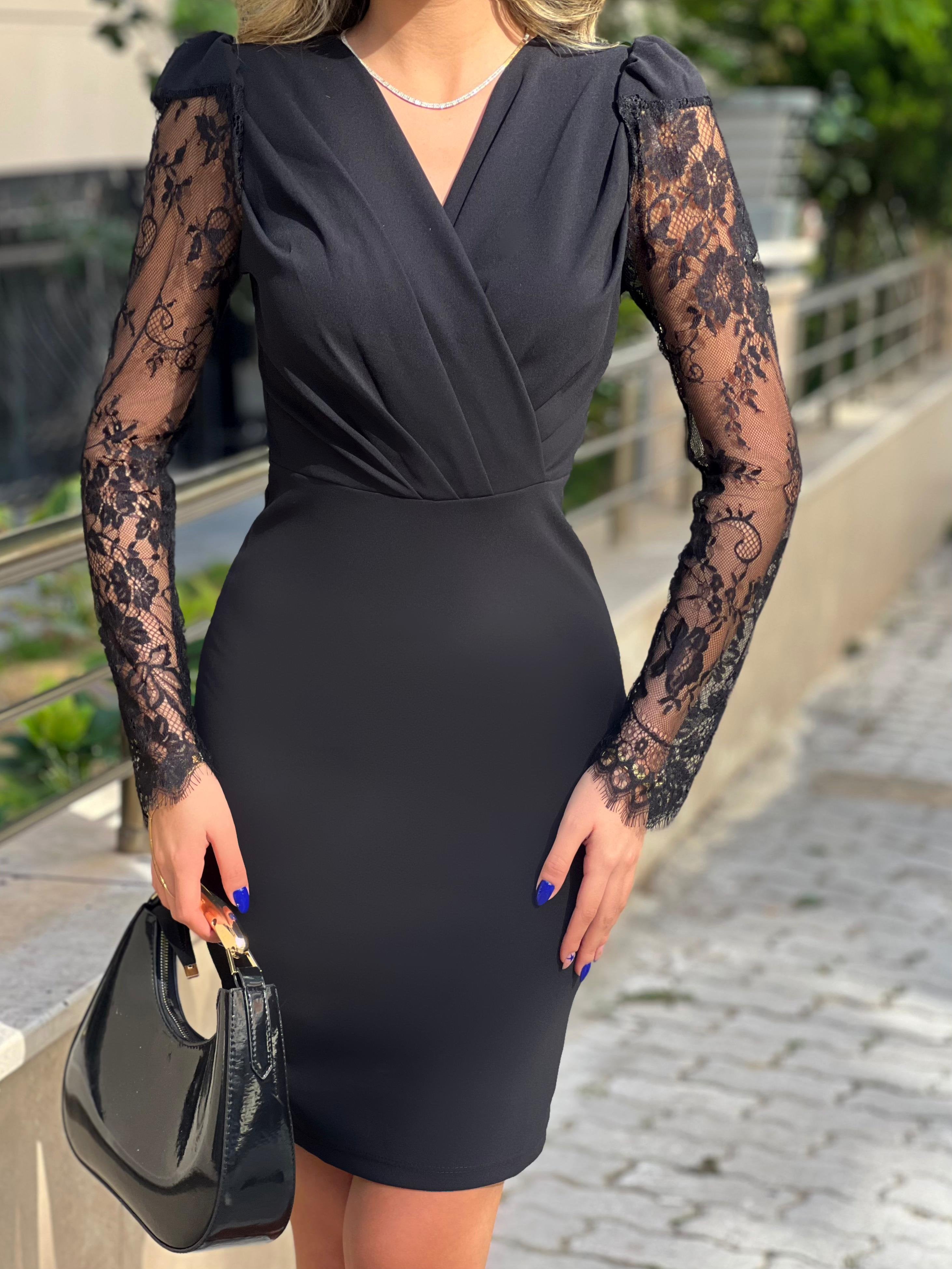 Kadın Uzun Kollu Kruvaze Yaka Kollar Tül Detay Krep Mini Boy Elbise