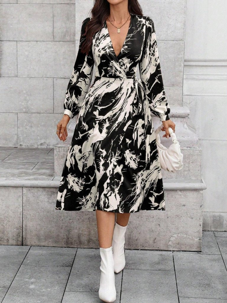 Kadın Uzun Kollu Kruvaze Yakalı Yandan Bağlamalı Desenli Mini Modal Elbise