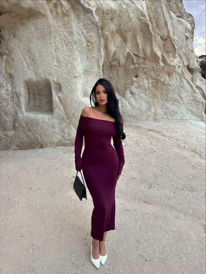 Kadın Uzun Kollu Madonna Yaka Midi Boy Elbise