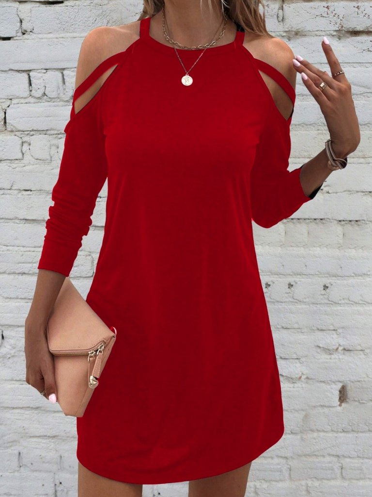 Kadın Uzun Kollu Omuz Açık Askı Detay Viskon Mini Boy Elbise