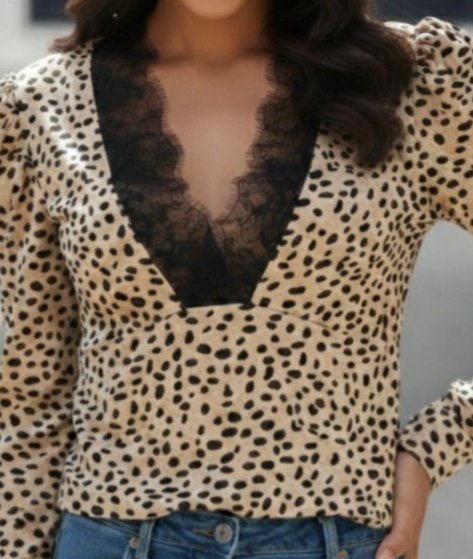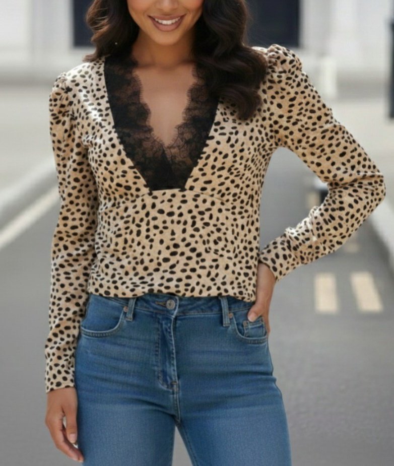 Kadın Uzun Kollu önden Derin Dantel Yaka Leopar Desenli Dalgıç Bluz