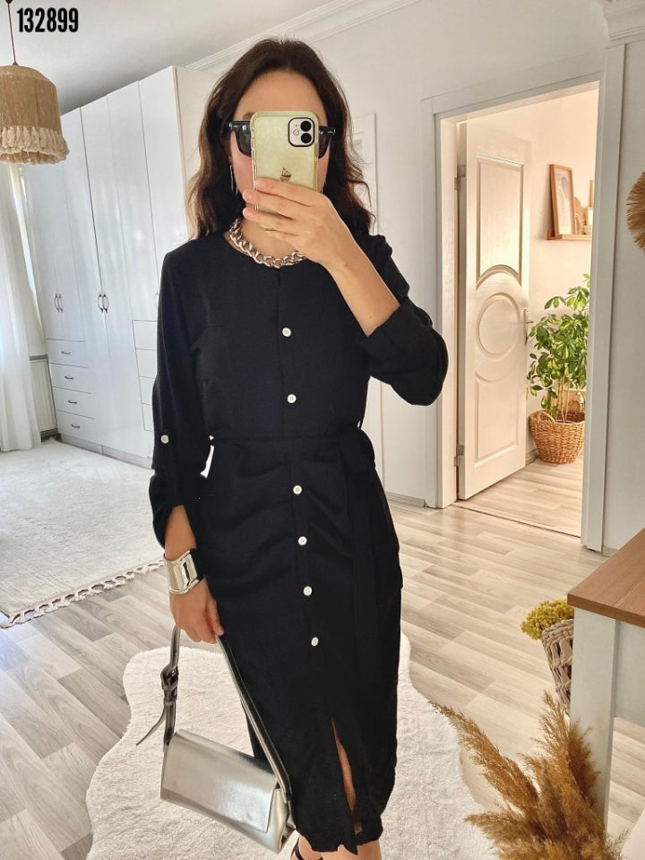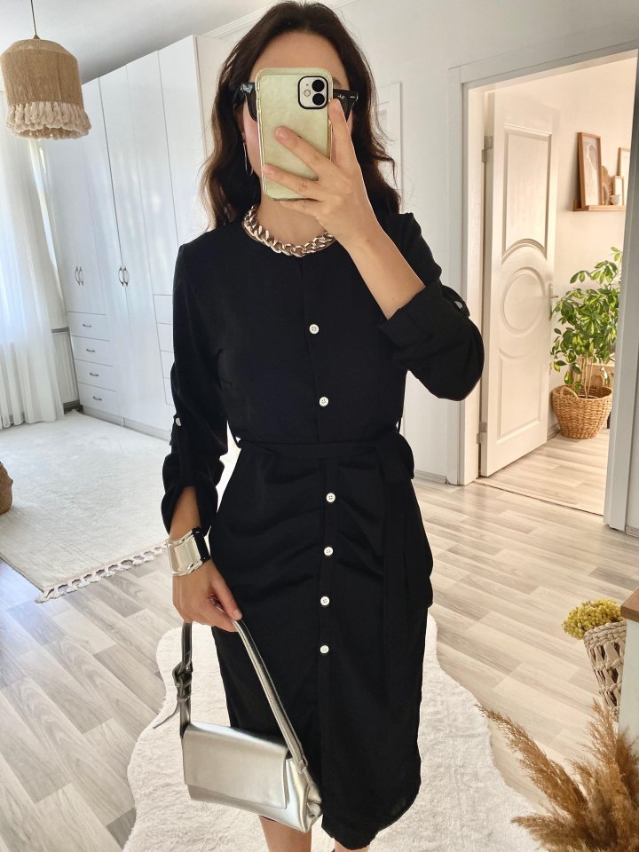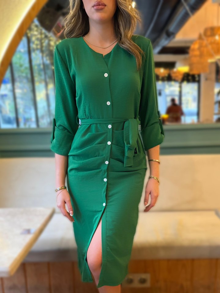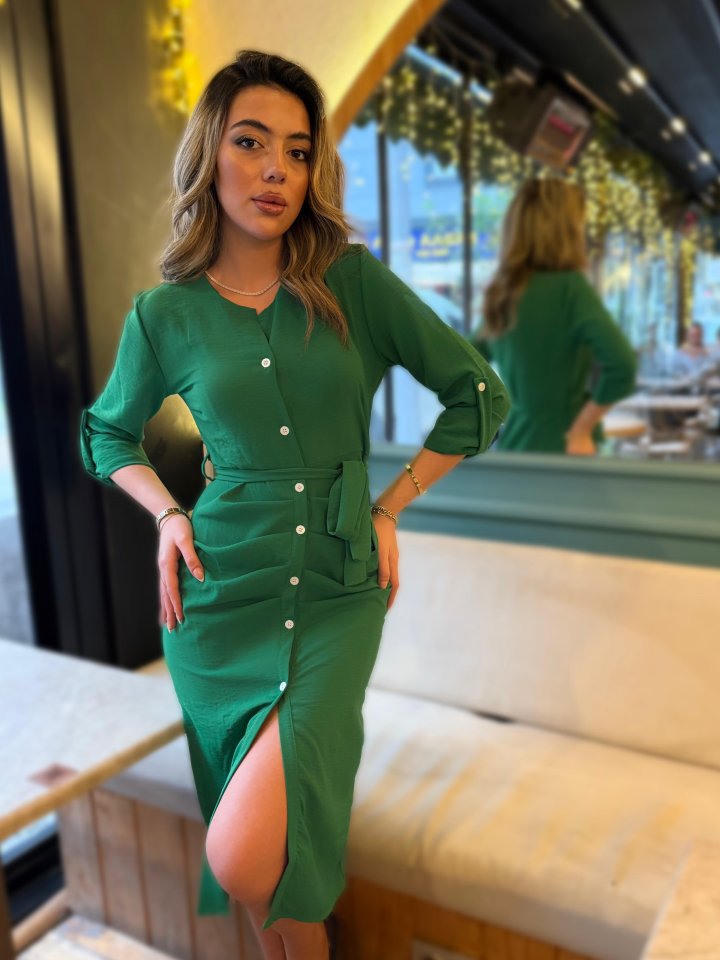 Kadın Uzun Kollu önden Düğmeli Beli Kuşaklı Aerobin Midi Elbise