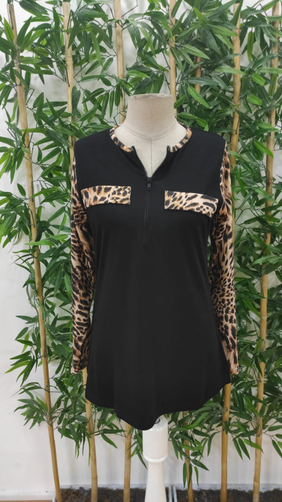 Kadın Uzun Kollu önden Fermuarlı Cepli Leopar Detaylı Viskon