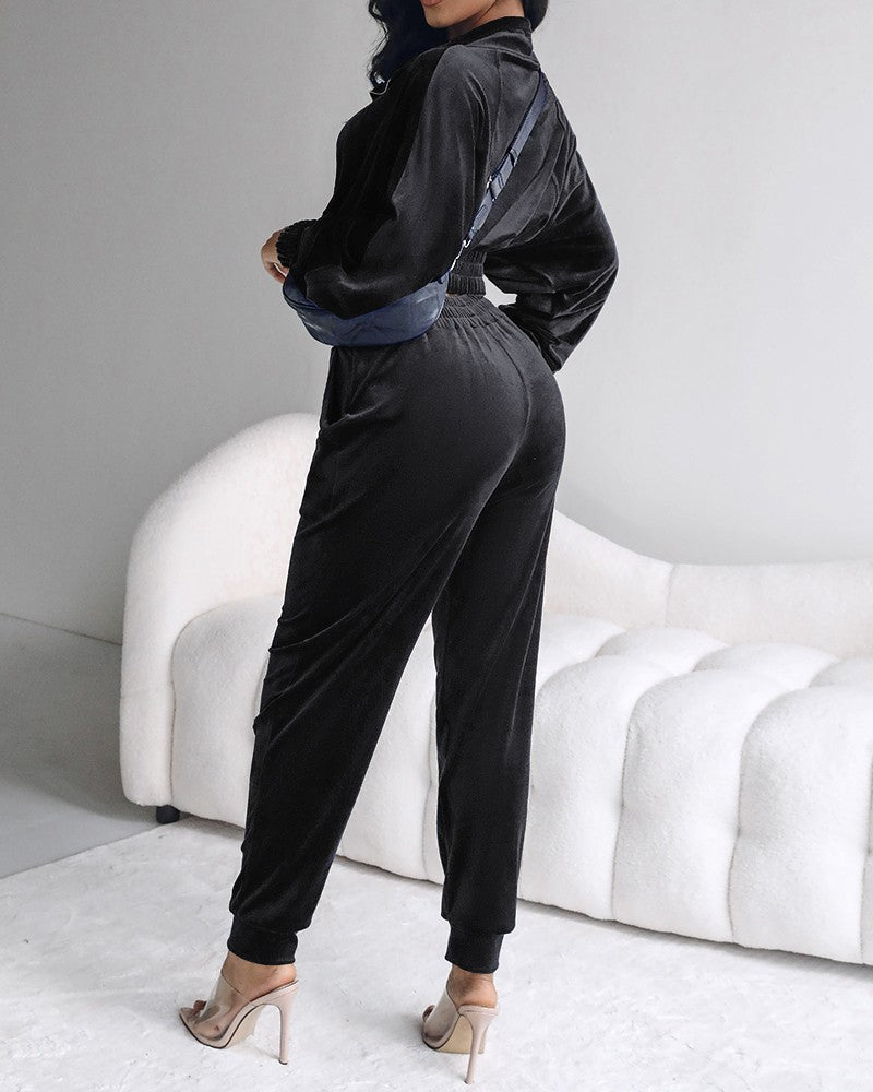 Kadın Uzun Kollu önden Fermuarlı Krop Kadife Ceket Ve Pantolon Ikili Takım