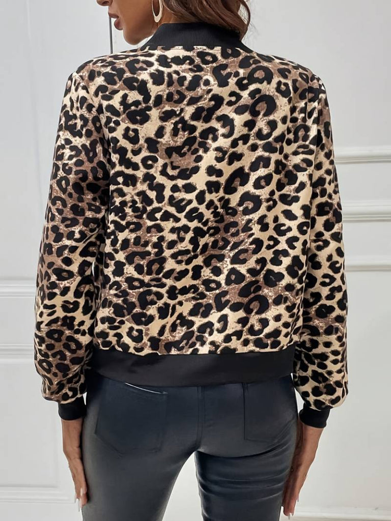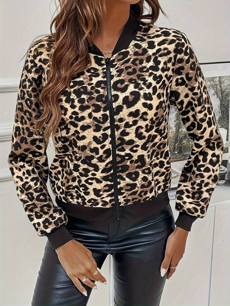 Kadın Uzun Kollu önden Fermuarlı Leopar Baskılı şardonlu Dalgıç Ceket