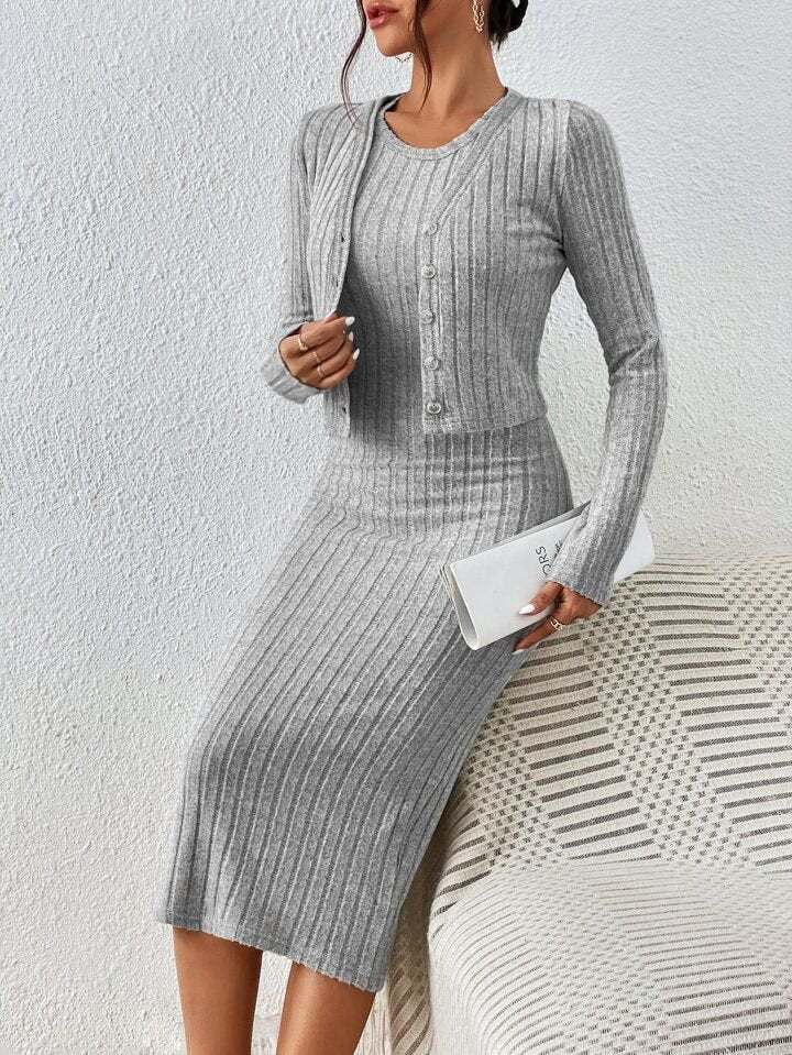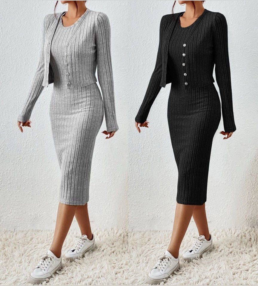 Kadın Uzun Kollu şardonlu Kaşkorseönü Düğmeli Mini Boy Elbise Ikili Takım