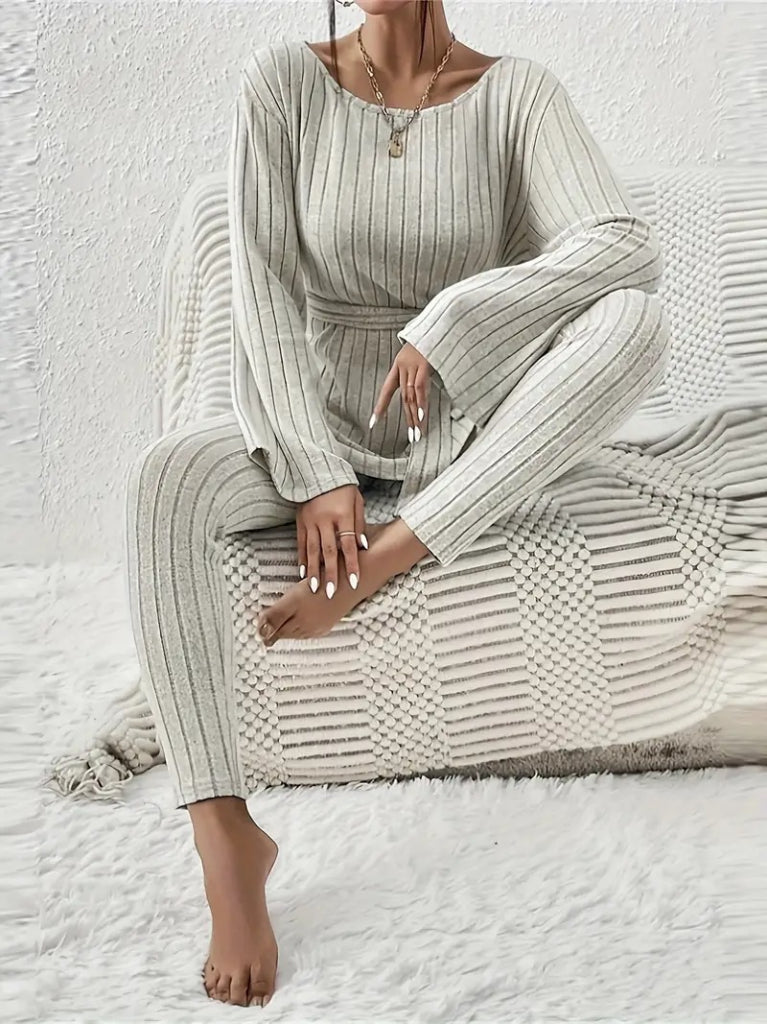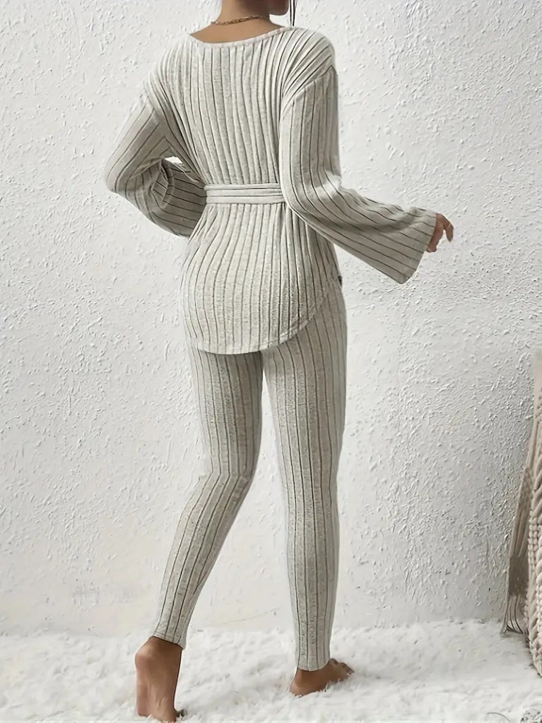 Kadın Uzun Kollu Tek Omuzu Açık Belden Kuşaklı şardonlu Kaşkorse Bluz Ve Tayt Pantolon
