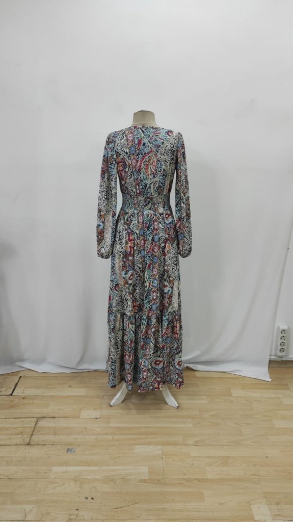 Kadın Uzun Kollu Uakadabağcıklı Beli Lastikli Desenli Uzun Süprem Elbise