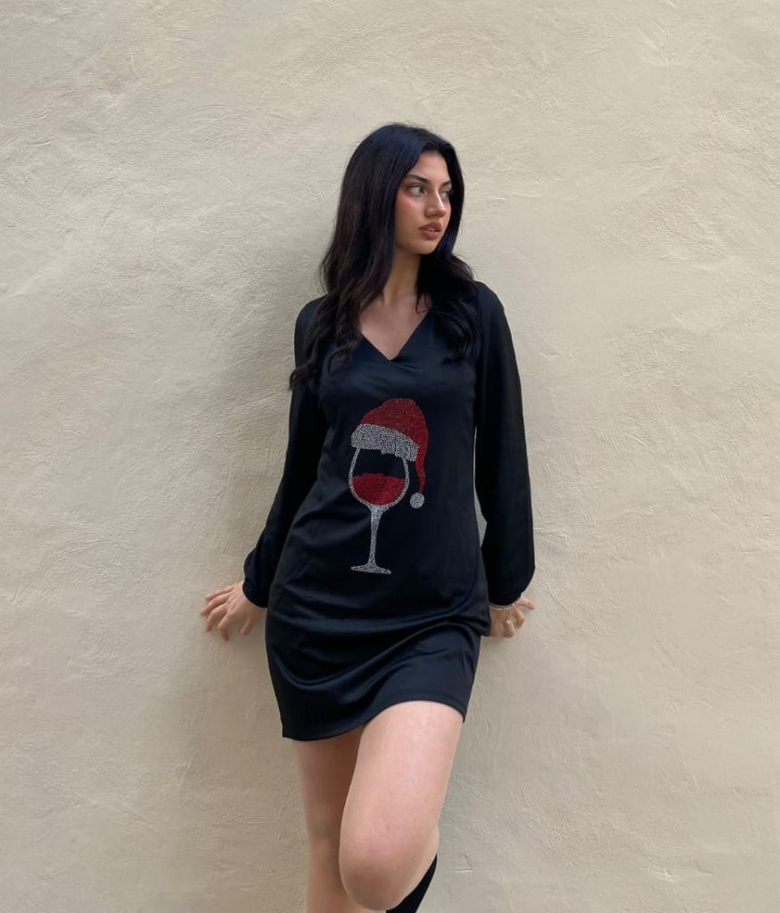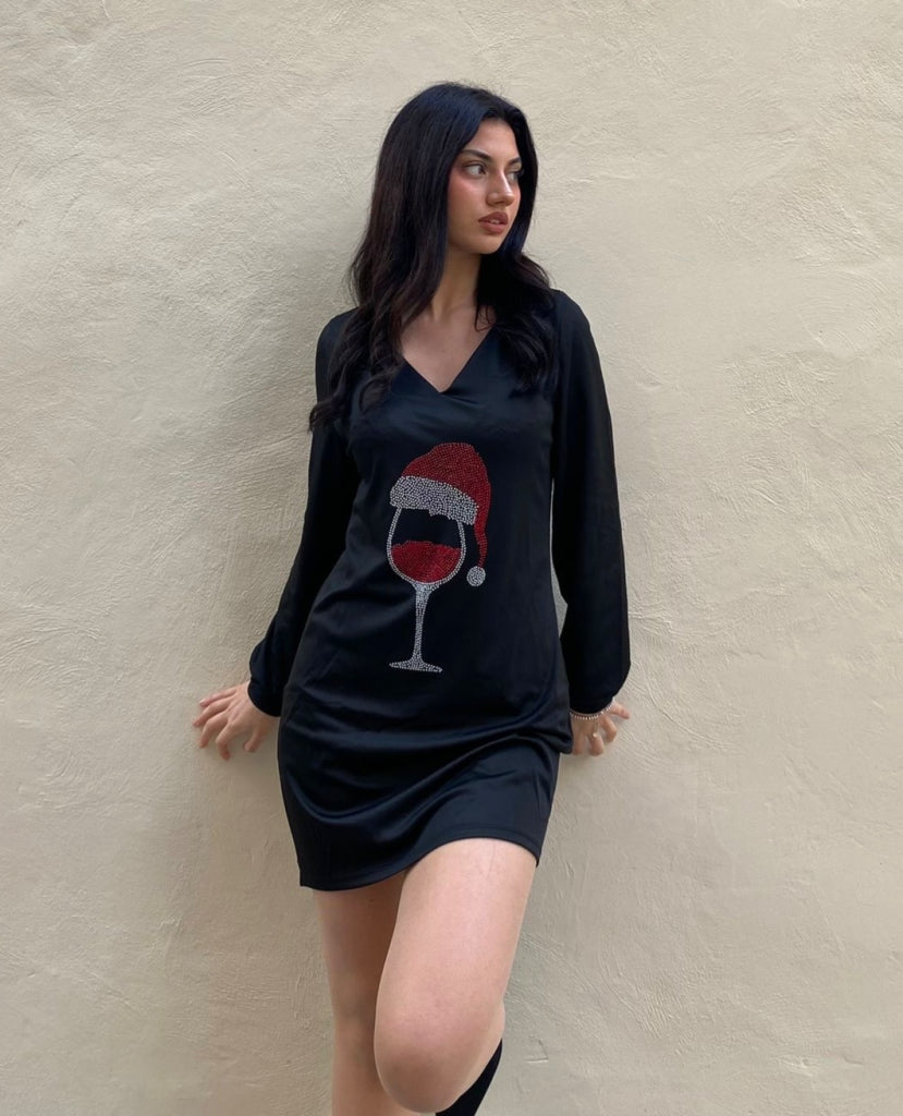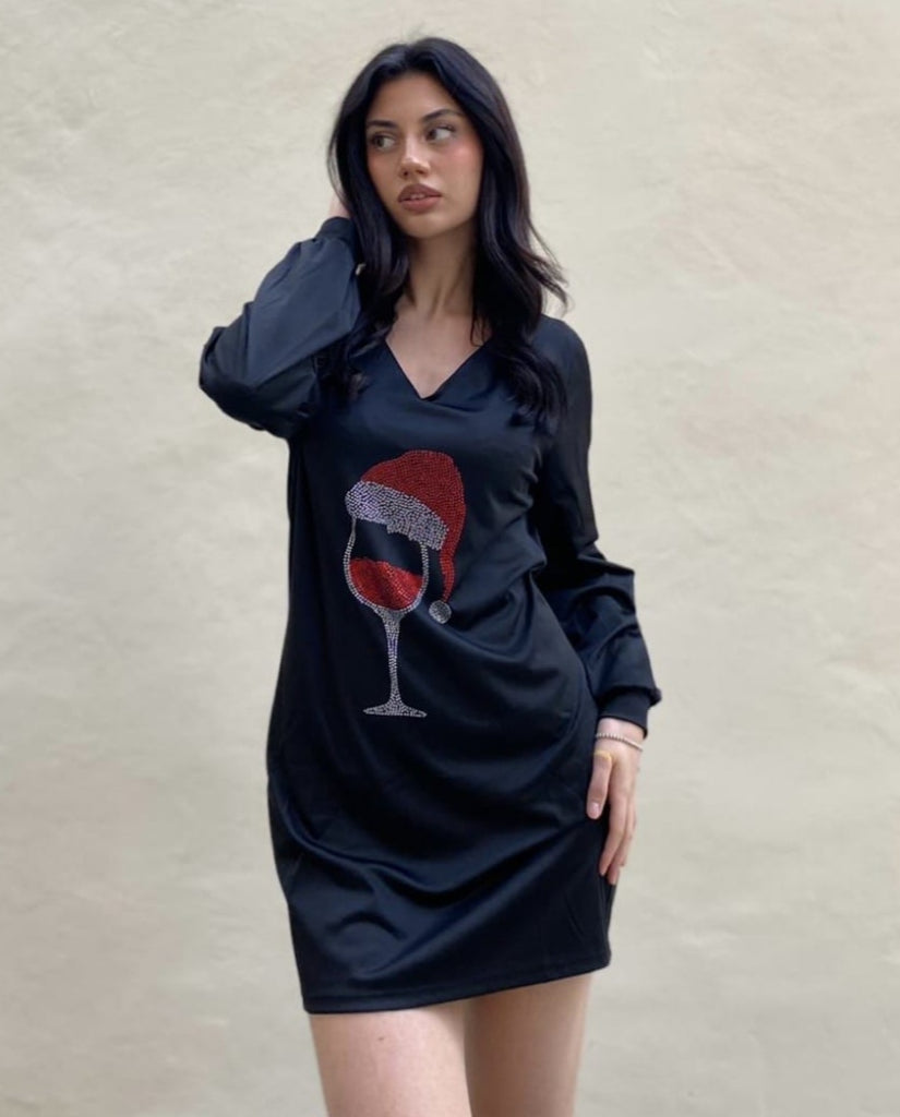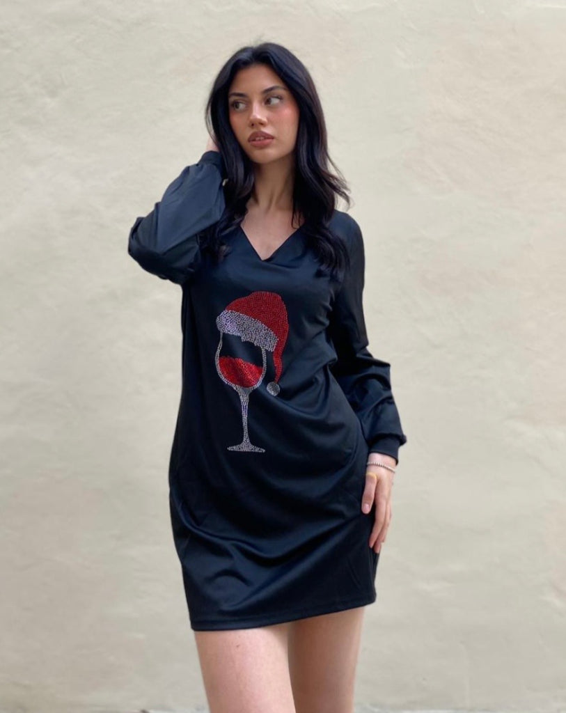 Kadın Uzun Kollu V Yaka Baskılı Dalgıç Kumaş Elbise