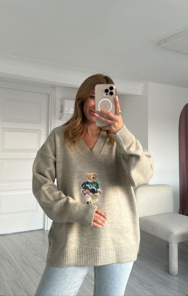 Kadın Uzun Kollu V Yaka Efsane Yumoş Kumaş Ayıcık Baskılı Kazak