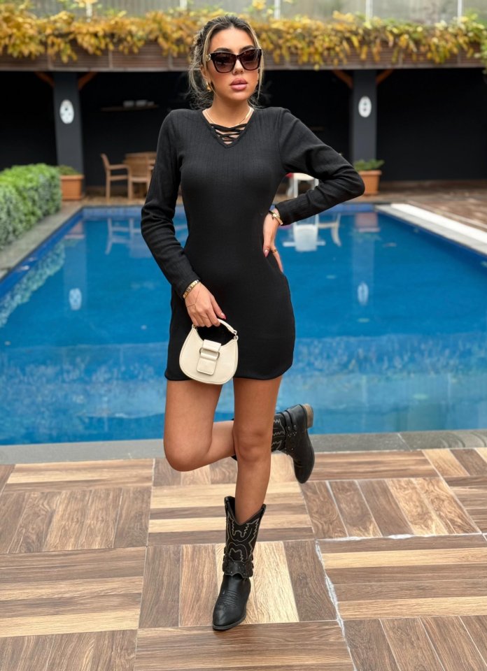 Kadın Uzun Kollu V Yakalı çapraz şerit Detaylı şardonlu Kaşkorse Midi Elbise