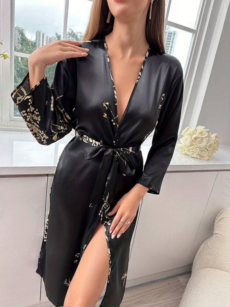 Kadın Uzun Kollu V Yakalı çiçek Baskılı Belden Kuşaklı Midi Saten Gecelik