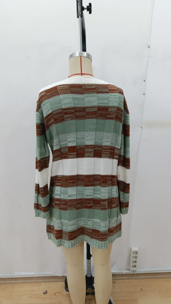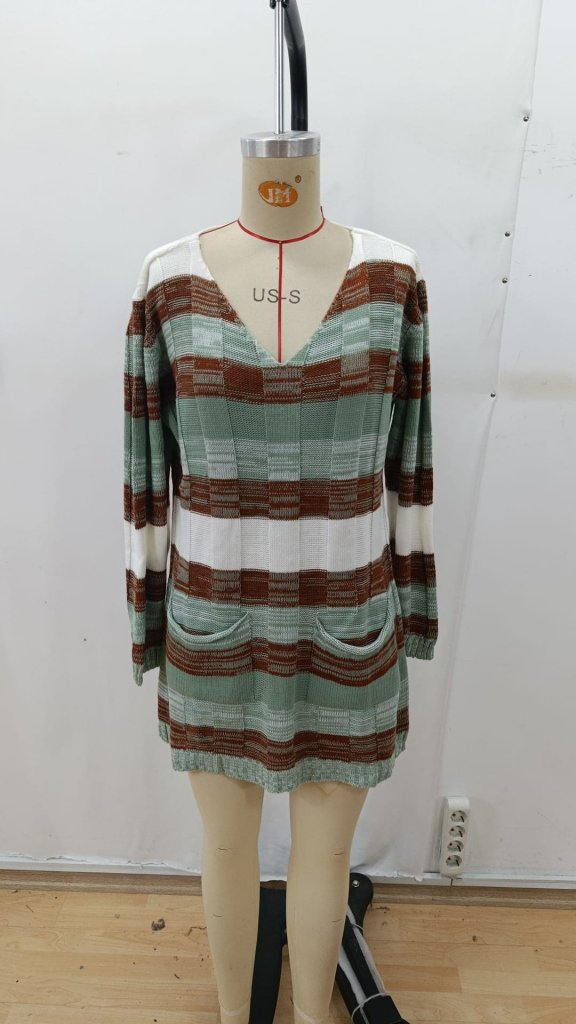Kadın Uzun Kollu V Yakalı çizgili çok Renkli Triko Mini Elbise