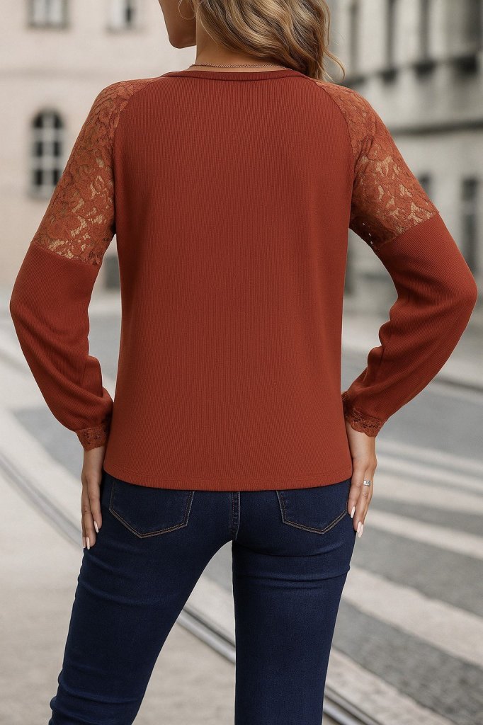 Kadın Uzun Kollu V Yakalı Dantelli Waffle Bluz