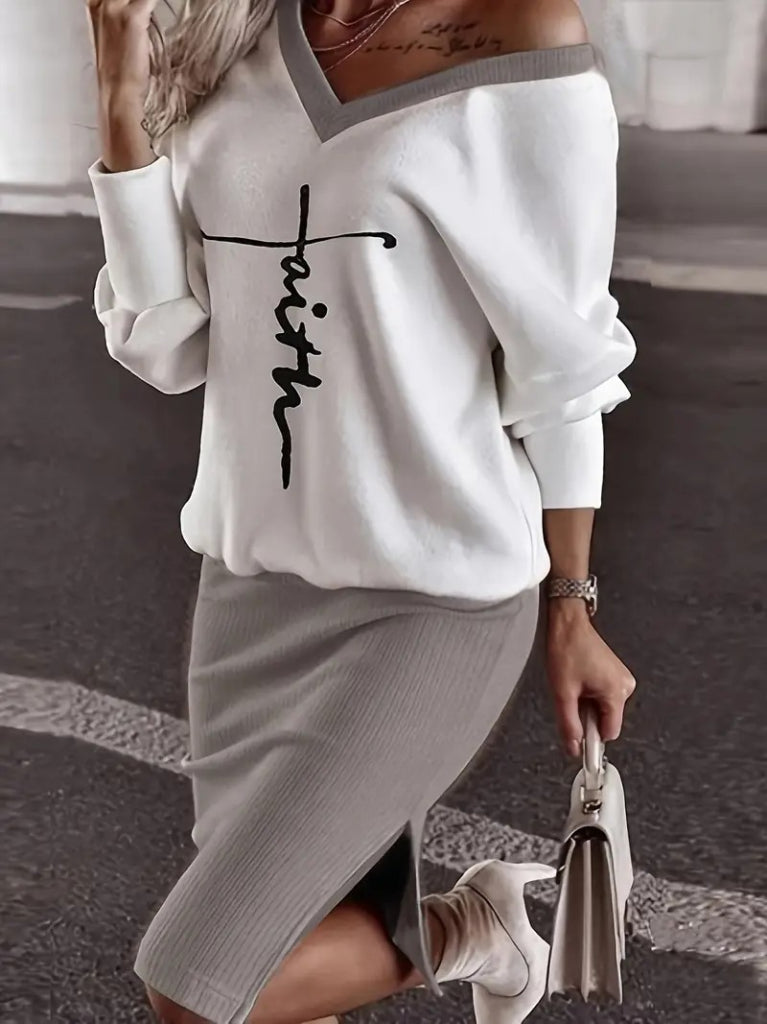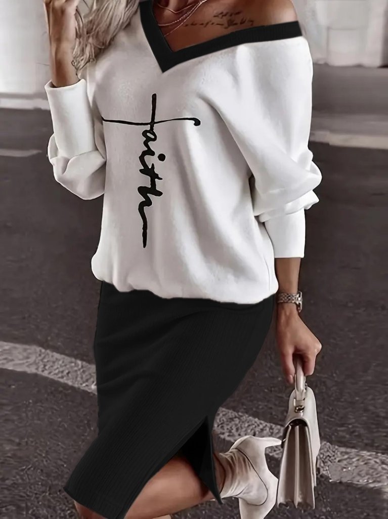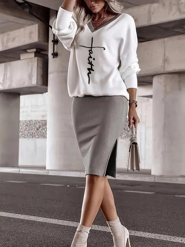 Kadın Uzun Kollu V Yakalı Iki Iplik Bluz Ve şardonlu Kaşkorse Etek Ikili Takım