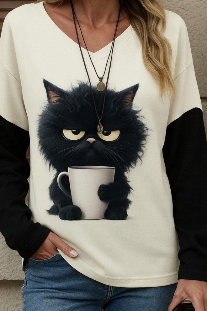 Kadın Uzun Kollu V Yakalı Kedi Baskılı şardonlu Dalgıç Bluz