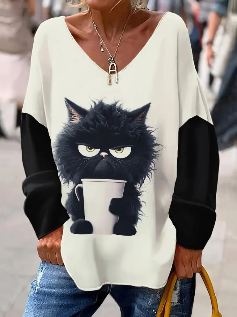 Kadın Uzun Kollu V Yakalı Kedi Baskılı şardonlu Dalgıç Bluz