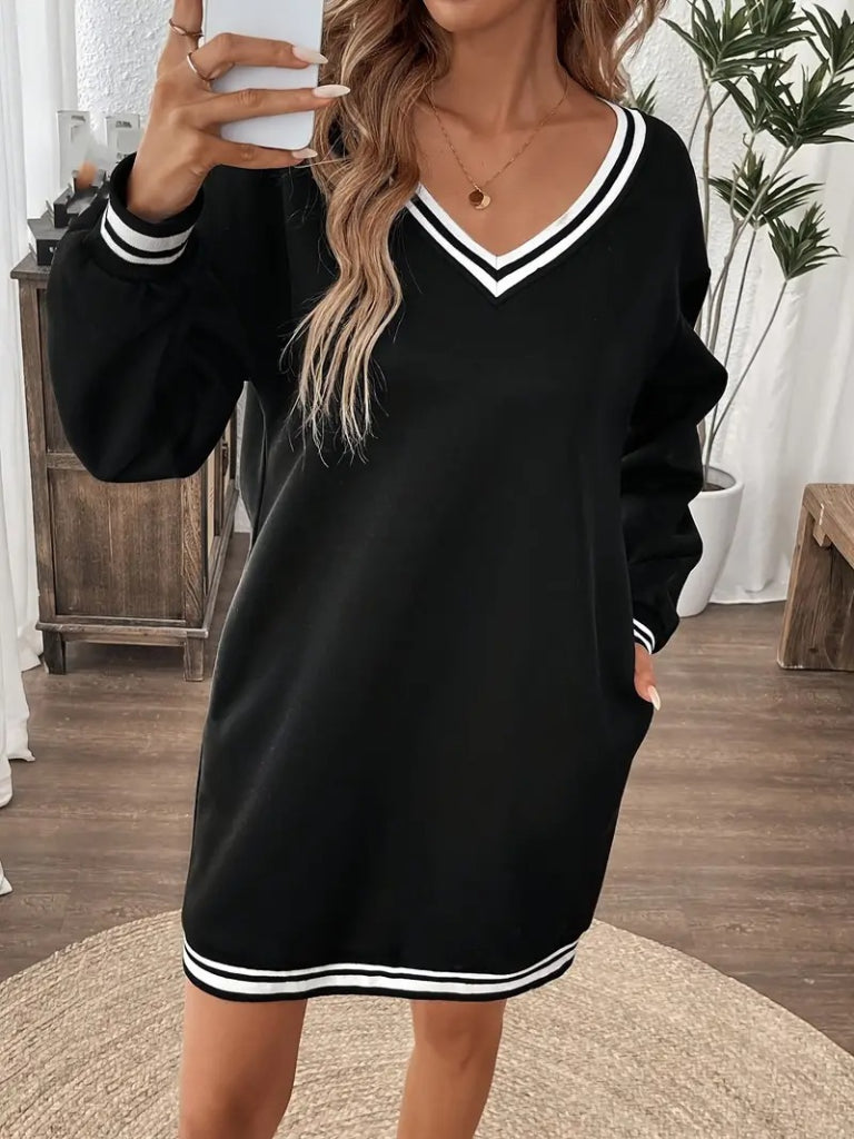 Kadın Uzun Kollu V Yakalı şerit Detaylı Kısa Viskon Iki Iplik Elbise