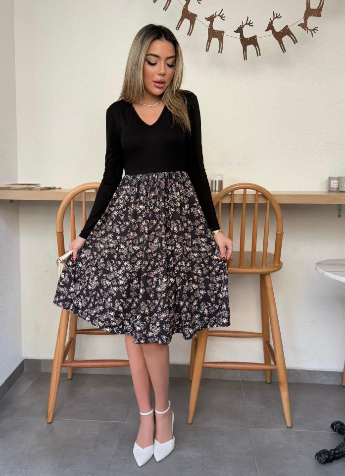 Kadın Uzun Kollu V Yakalı üst Viskon Alt çiçek Desenli Süprem Kısa Elbise