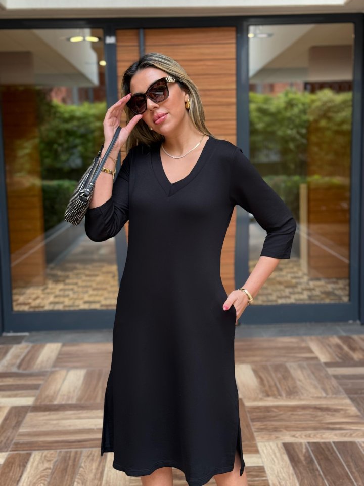 Kadın Uzun Kollu V Yakalı Yanlardan Yırtmaçlı Viskon Iki Iplik Midi Elbise