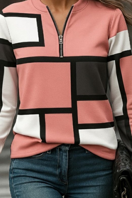 Kadın Uzun Kollu Yakadan Fermuarlı Desenli şardonlu Dalgıç Bluz