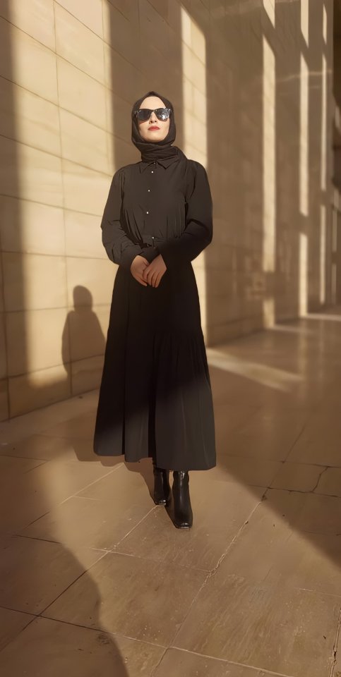 Kadın Uzun Kollu Yakalı önden Düğmeli Beli Metal Kemerli Dokuma Maksi Elbise