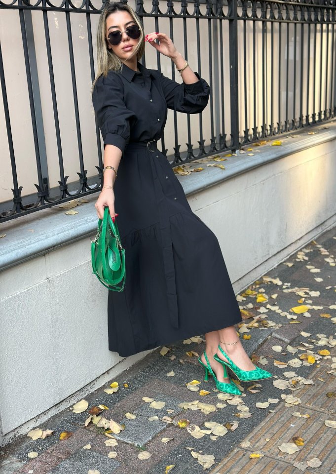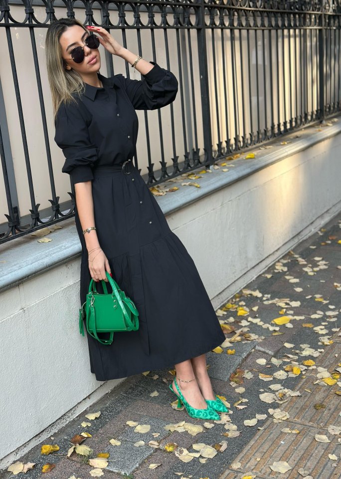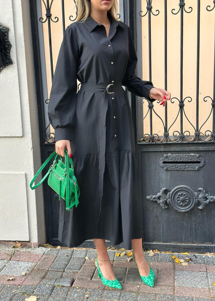 Kadın Uzun Kollu Yakalı önden Düğmeli Beli Metal Kemerli Dokuma Maksi Elbise