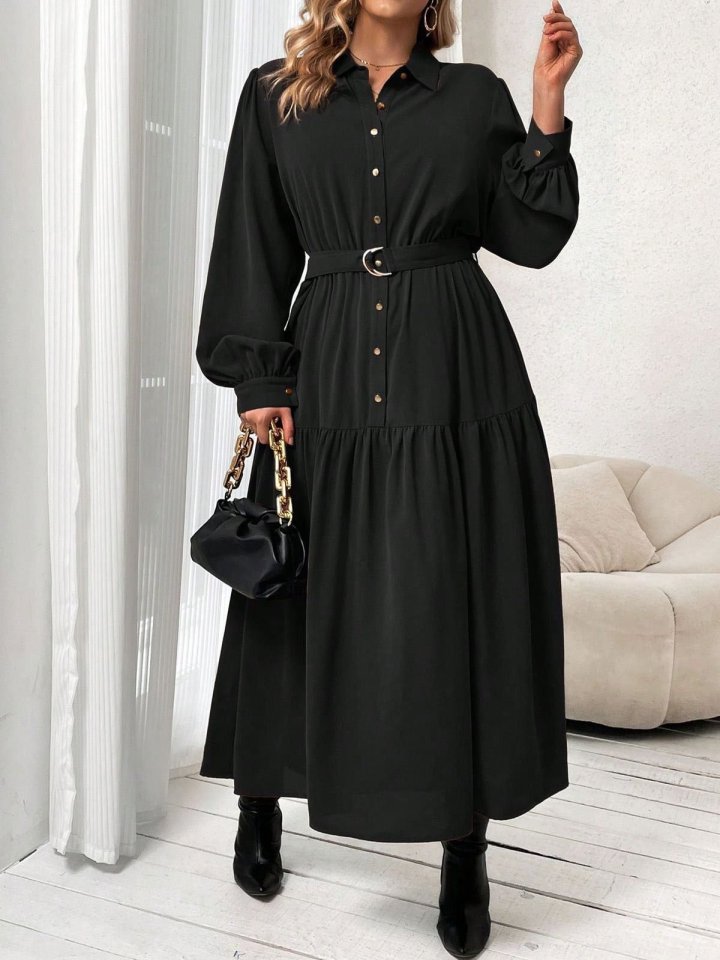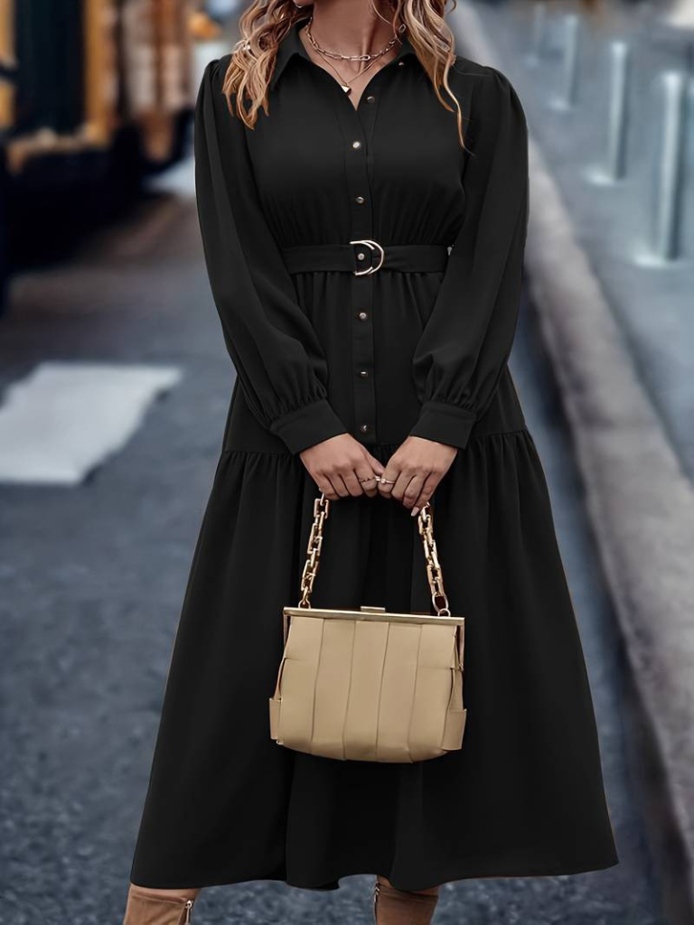 Kadın Uzun Kollu Yakalı önden Düğmeli Beli Metal Kemerli Dokuma Maksi Elbise