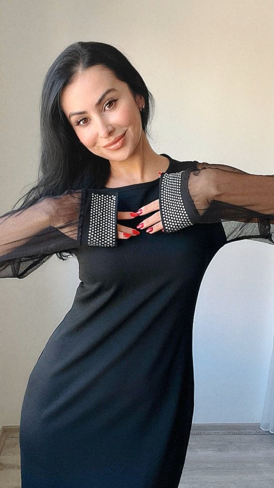 Kadın Uzun Kollu Yakası Yanlardan Hafif Açık Kollar Tül Ve Taş Detay Kısa Krep Elbise
