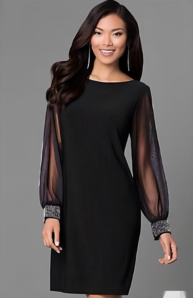 Kadın Uzun Kollu Yakası Yanlardan Hafif Açık Kollar Tül Ve Taş Detay Kısa Krep Elbise