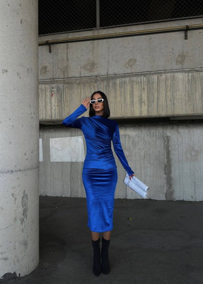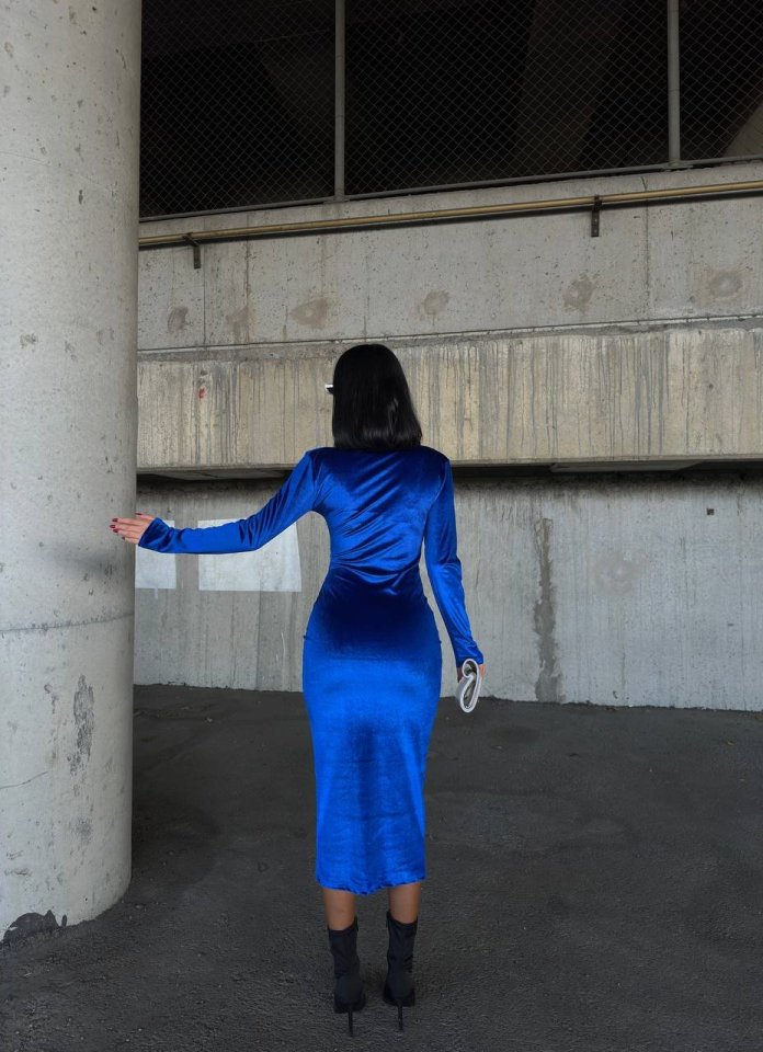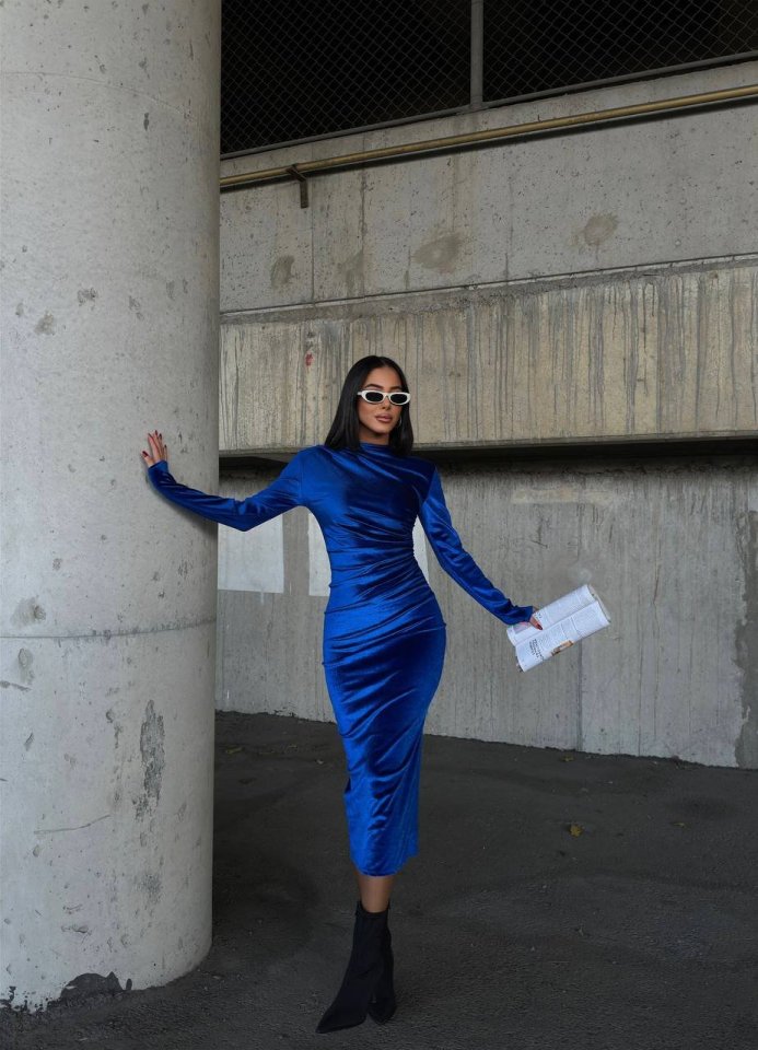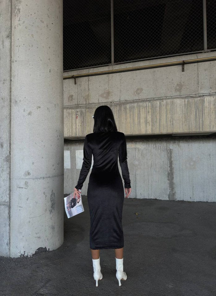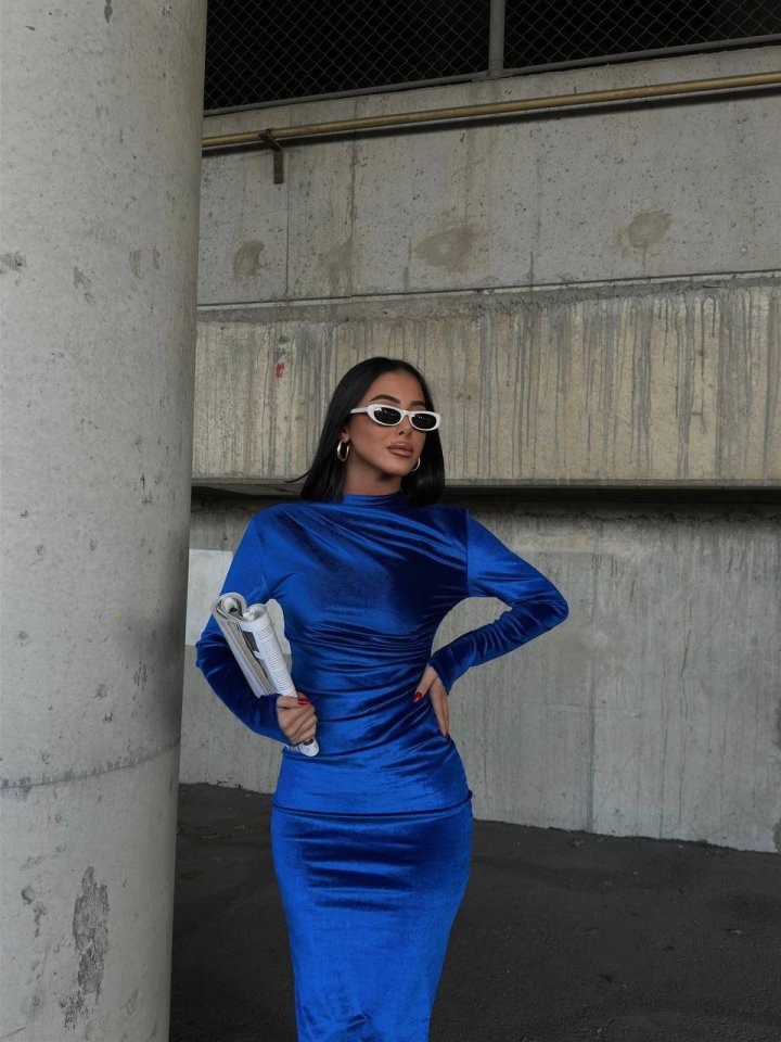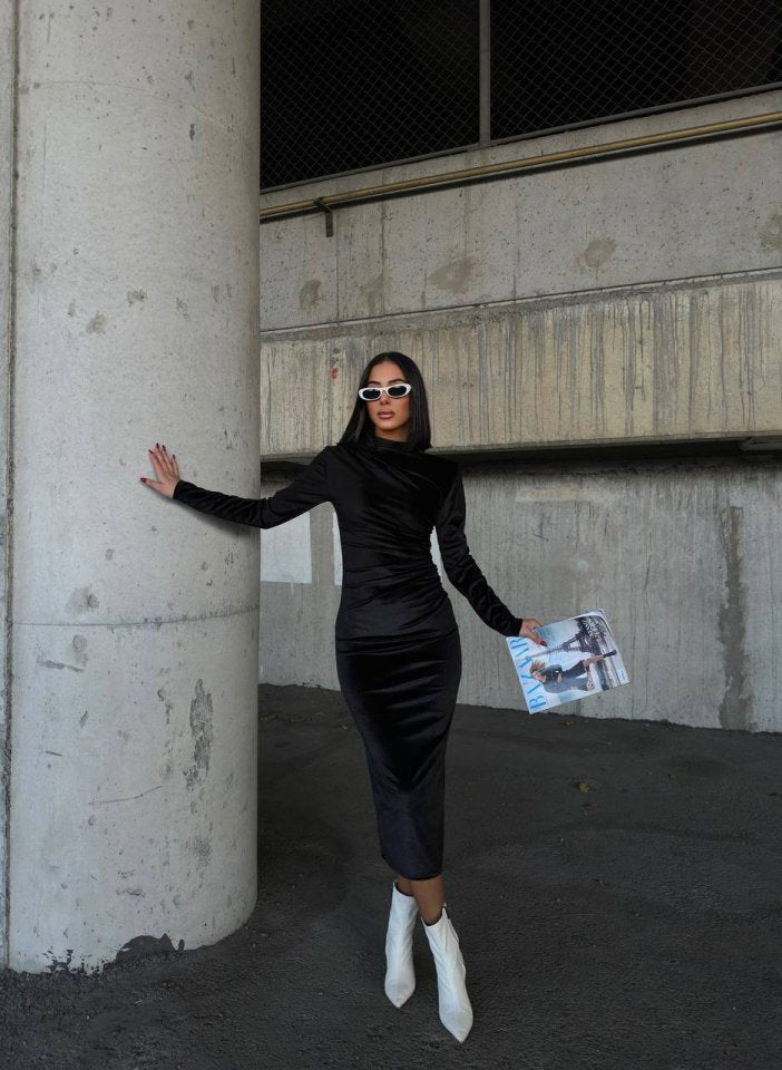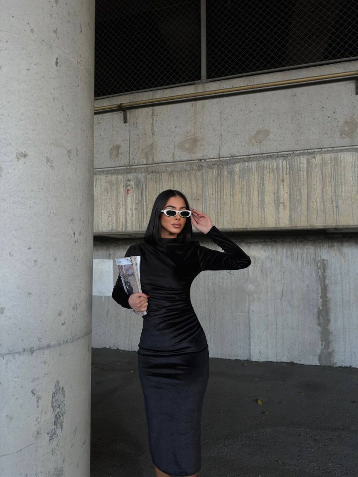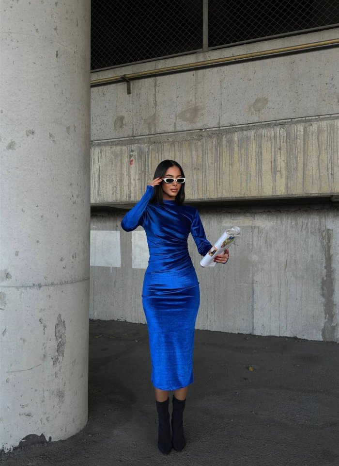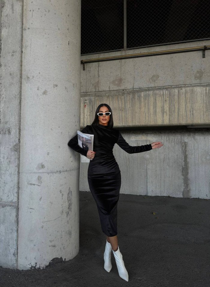 Kadın Uzun Kollu Yarım Balıkçı Yaka Büzgü Detay Kadife Kumaş Elbise
